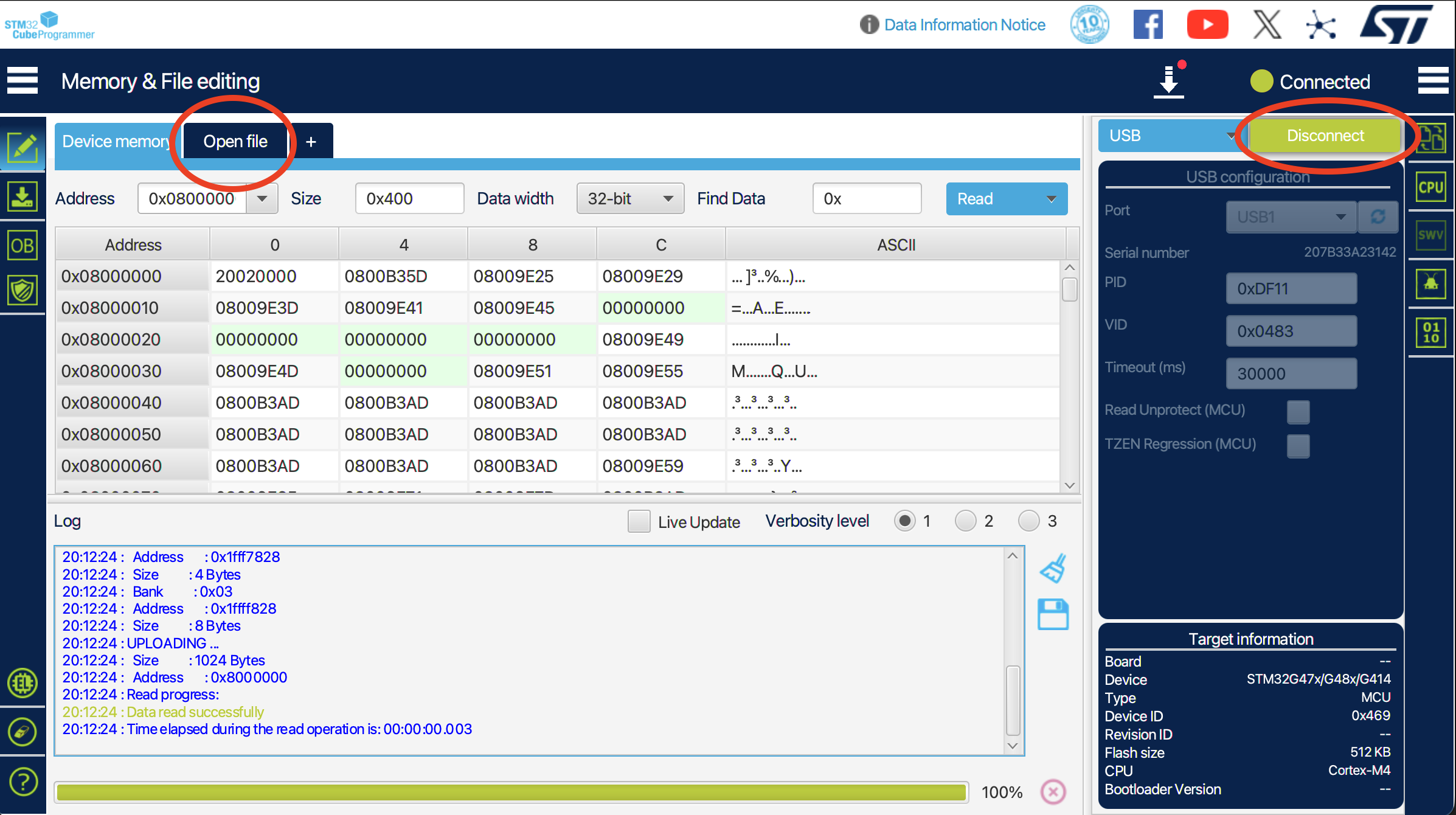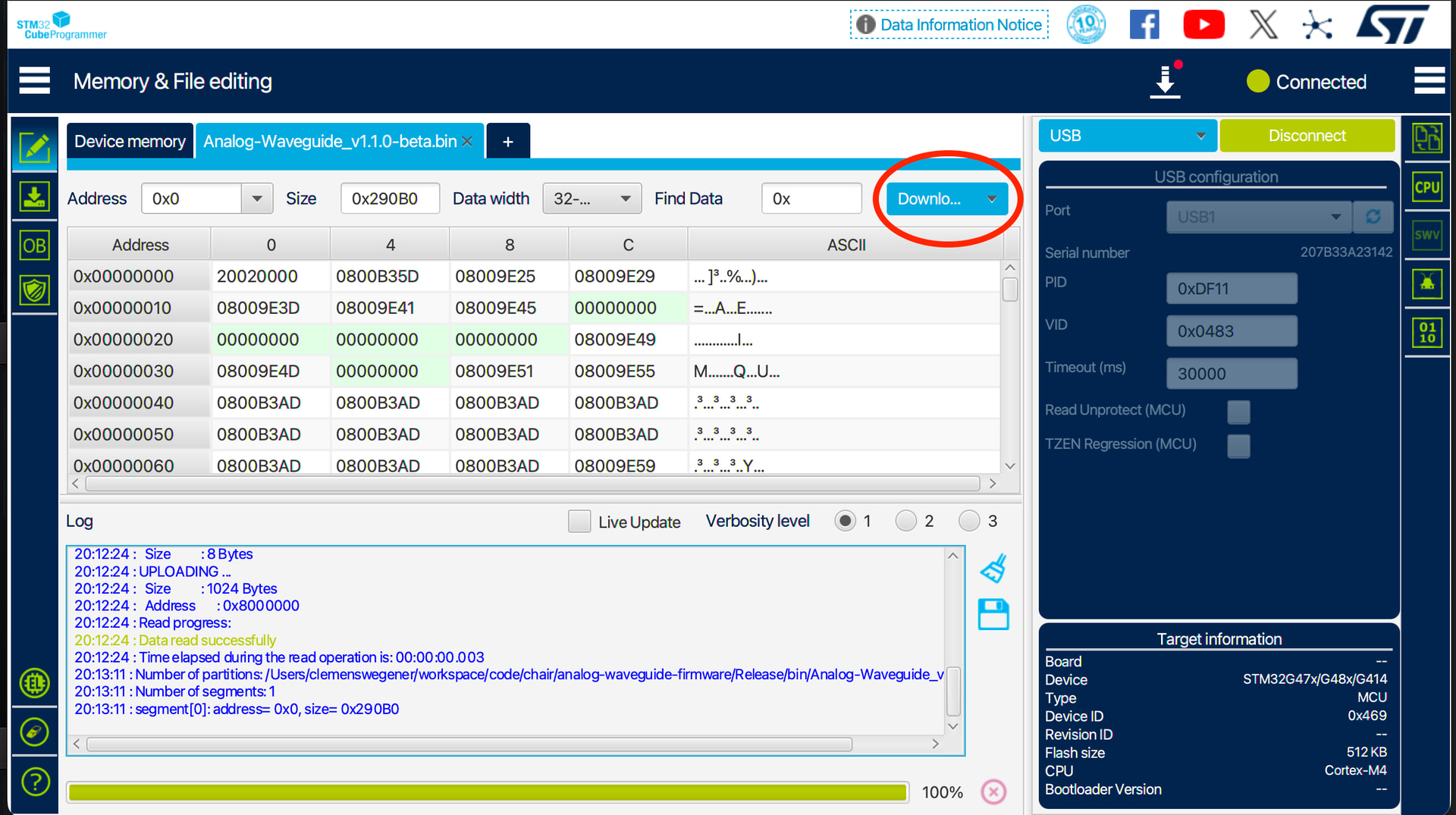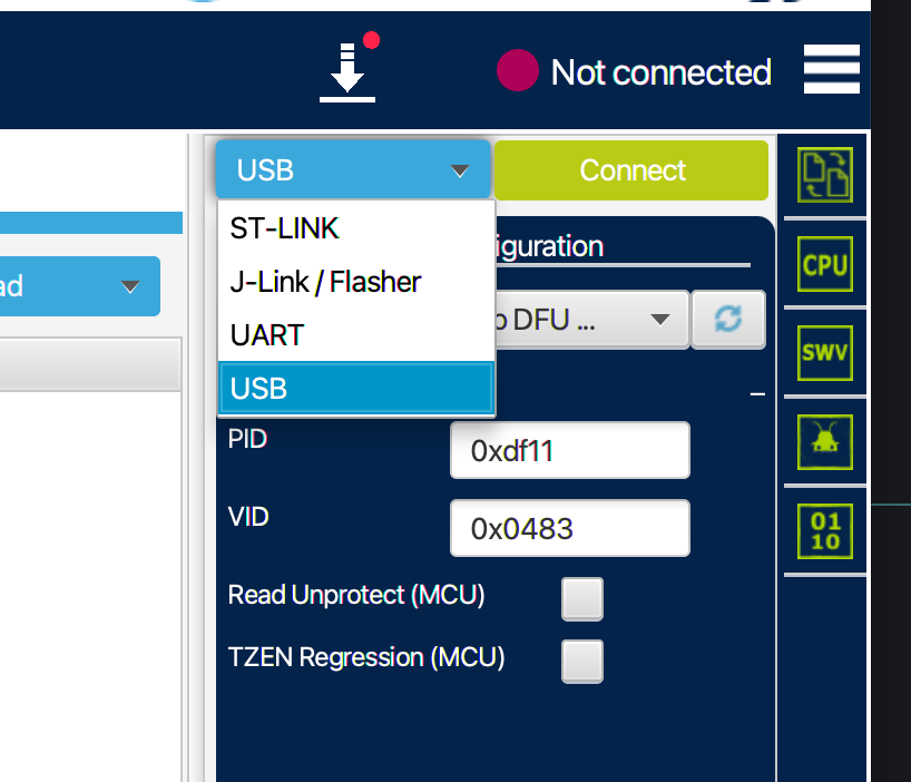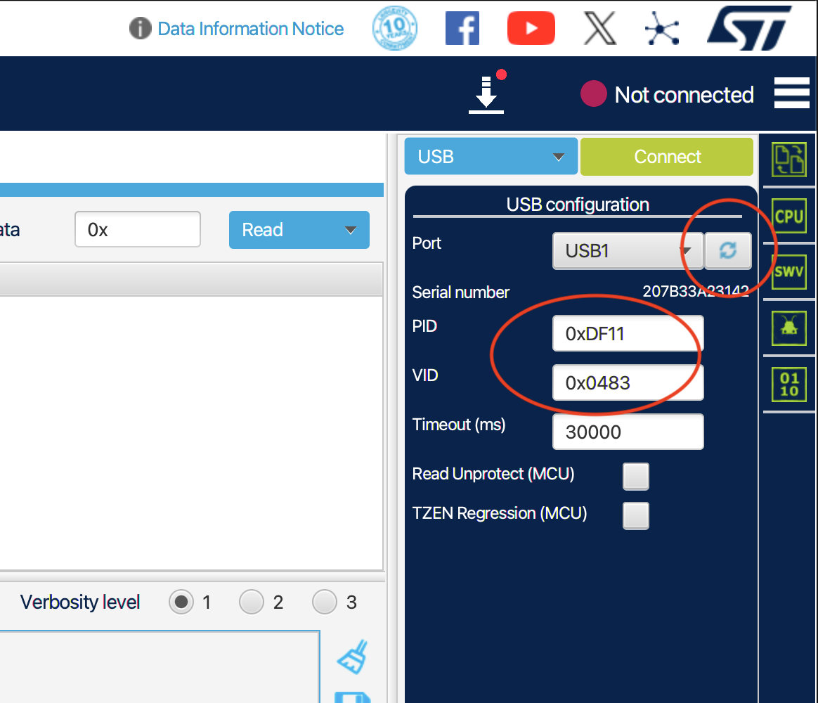 - Click “refresh”, choose device with PID: 0xDF11 VID: 0x0483